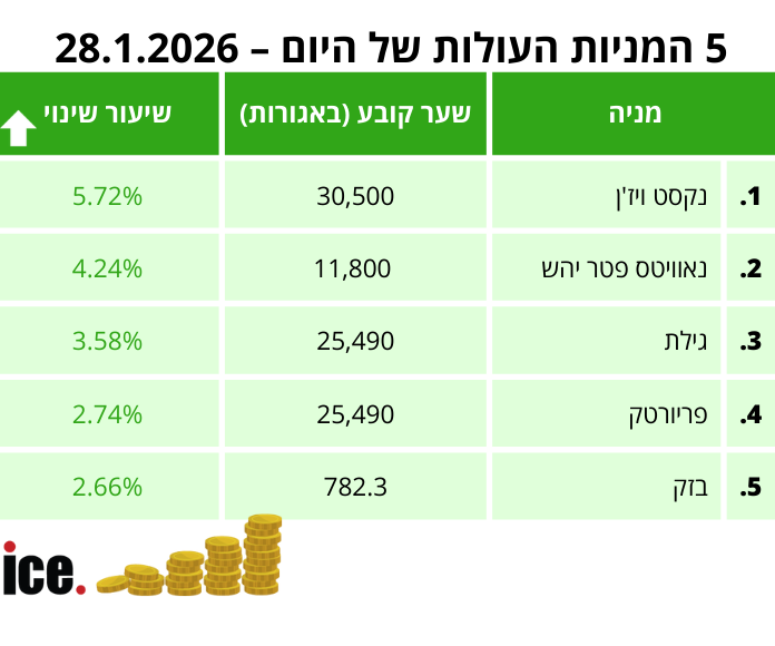 במסגרת 5 המניות העולות: במקום הראשון שומרת על מקומה מאתמול, מניית נקסט ויז'ן עם עלייה משמעותית של 5.72% לרמה של 30,500 אגורות. במקום השני נאוויטס פטר יהש רשמה עלייה של 4.24% לרמה של 11,800 אגורות.