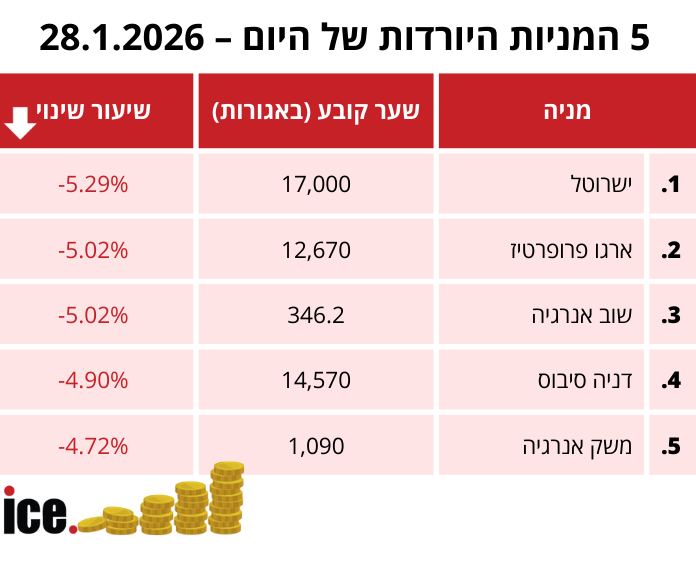 במסגרת 5 המניות היורדות הבולטות: במקום הראשון ישרוטל עם ירידה של 5.29% לרמה של 17,000 אגורות. במקום השני מתחלקות מניית ארגו פרופרטיז עם ירידה של 5.02% לרמה של 12,670 אגורות, ומניית שוב אנרגיה עם ירידה של 5.02% לרמה של 346.2 אגורות.