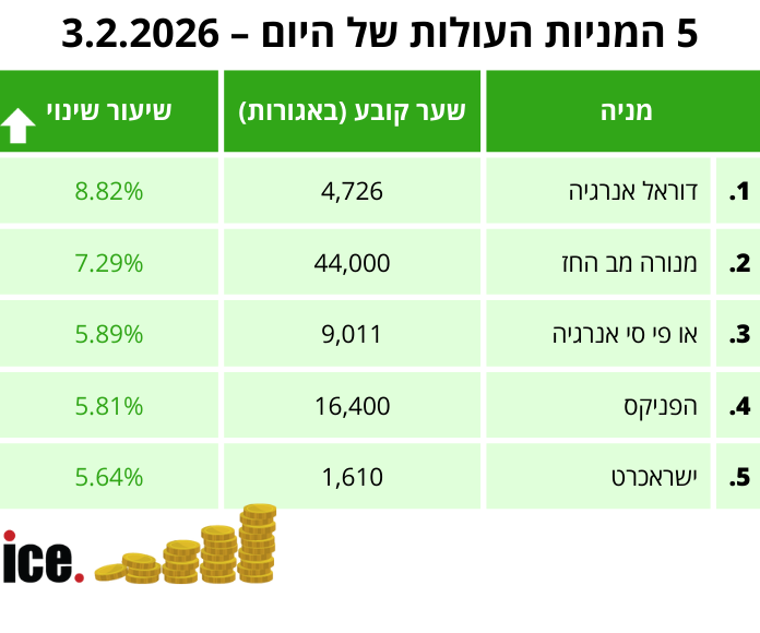 בקרב חמש המניות העולות, המנצחת הגדולה היא מנייתה של דוראל אנרגיה. המנייה זינקה ב-8.98% לרמה של 4,733 אגורות. מייד אחריה, מנייתה של מנורה מבטחים עלתה ב-7.29% לרמה של 44,000 אגורות. את המקום השלישי, תופסת הפניקס. המנייה עלתה בסיום המסחר ב-7.16% לרמה של 16,610 אגורות. מייד אחריה, ישרס שעלתה ב-6.91% לרמה של 104,790 אגורות.
