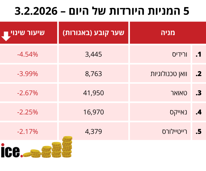 בקרב חמש המניות היורדות, המפסידה הגדולה היא ורידיס. מנייתה צנחה בסיום יום המסחר ב-4.63% לרמה של 3,442 אגורות. וואן טכנולוגיות גם היא רשמה יום פחות מוצלח עבורה, כאשר המנייה ירדה ב-3.06% לרמה של 8,848 אגורות.