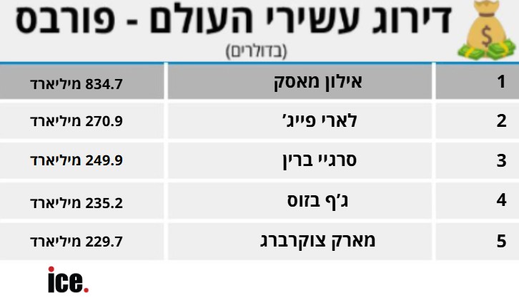 דירוג עשירי העולם השבועי של אתר ice מובא לפניכם כמדי שבוע, בהתבסס על נתונים בזמן אמת מ"פורבס". במקום הראשון, היזם אילון מאסק צובר 70 מיליארד דולר נוספים ומבסס את מעמדו, הרחק מכולם, בתור האיש העשיר בעולם.