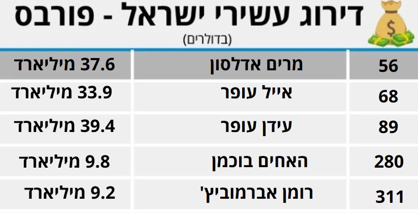 שבוע נוסף מגיע לסיומו ועמו מתפרסם במגזין "פורבס" דירוג עשירי ישראל, בראשו ניצבת המיליארדרית ואשת העסקים מרים אדלסון. הפילנתרופית מככבת במקום ה-56 בדירוג העולמי עם הון פרטי שמוערך בב-37.6 מיליארד דולר, כאשר במהלך השבוע היא איבדה 217 מיליון דולר.