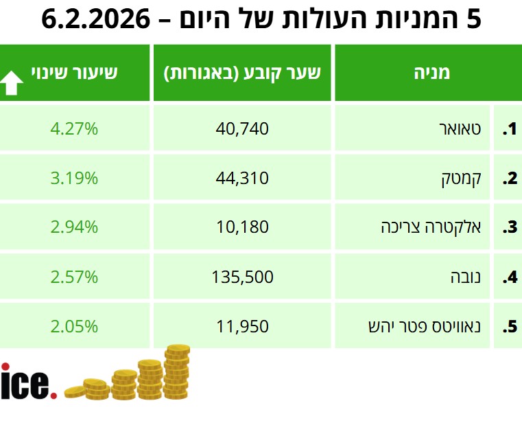 ברשימת חמש העולות ביותר: טאואר נוסקת ב-4.27% לשער 40,740 אגורות, קמטק מטפסת ב-3.19% לשער 44,310 אגורות, אלקטרה צריכה עולה 2.94% לשער 10,180 אגורות. נובה רושמת עלייה של 2.57% לשער 135,500 אגורות ונאוויטס פטר יהש סוגרת את הרשימה עם עלייה של 2.05% לשער 11,950 אגורות.