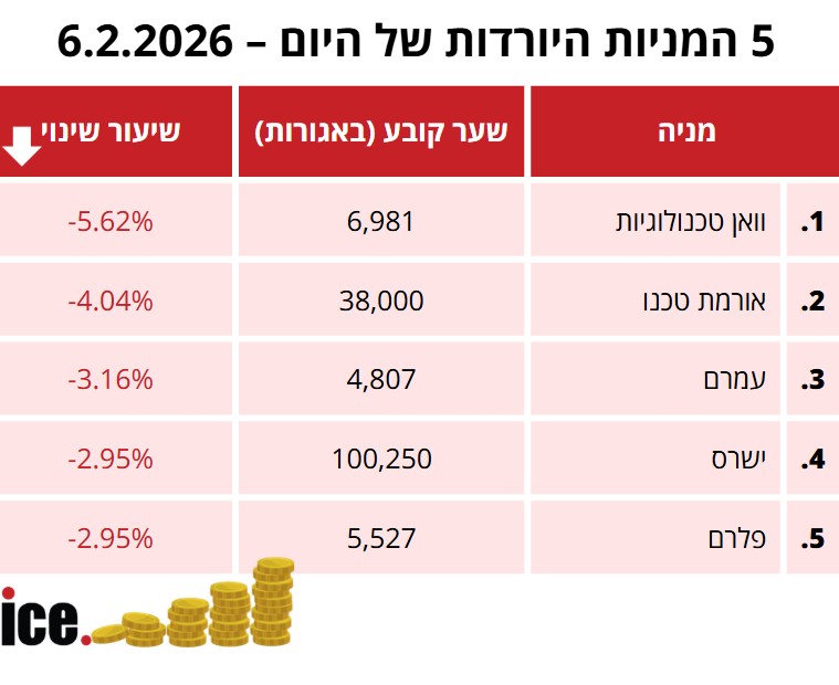 ברשימת חמש היורדות ביותר: וואן טכנולוגיות שצונחת ב-5.62% לשער 6,981 אגורות אורמת טכנו שצוללת 4.04% לשער 38,000 אגורות ועמרם שיורדת 3.16% לשער 4,807 אגורות. ישרס מאבדת 2.95% מערכה ויורדת לשער 100,250 אגורות ופלרם נועלת את רשימת היורדות, עם ירידה של 2.95% עד לשער 5,527 אגורות.