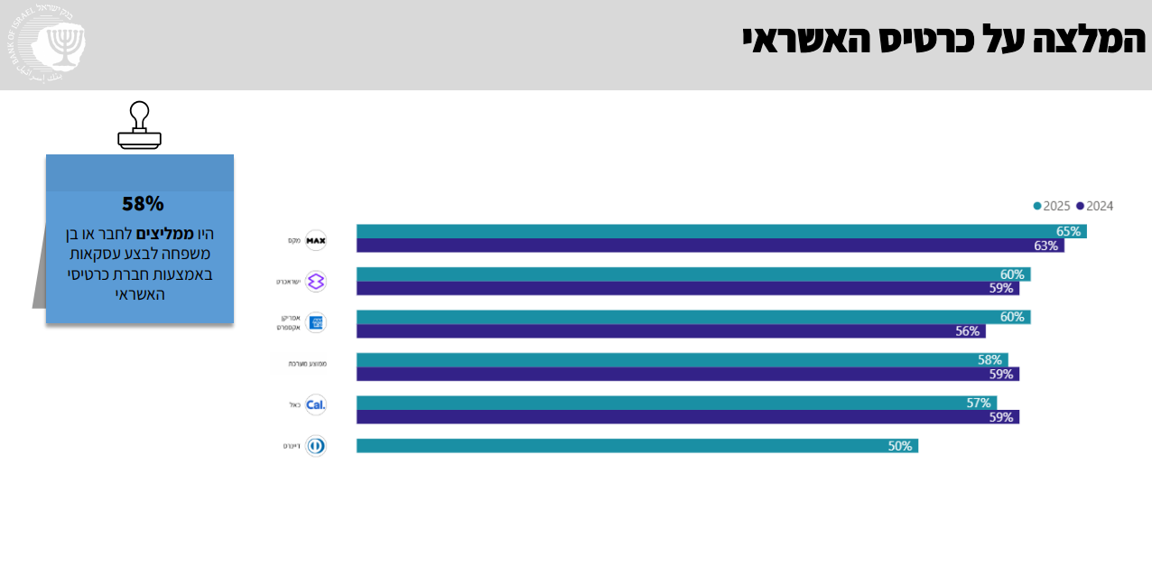 על איזו חברת כרטיסי אשראי ימליצו? מקס במקום הראשון לשנת 2025 עם 65%, ישראכרט אחריה עם 60%, כן גם אמריקן אקספרס עם 60%. כאל עם 57%, כאשר דיינרס עם 50%.
