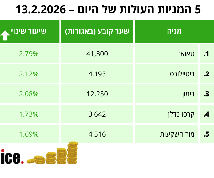 ברמת המניות בלטו לחיוב - מנית טאואר עם עלייה של 2.79%, ריטיילורס עם עלייה של 2.12% ורימון עם עלייה של 2.08%.