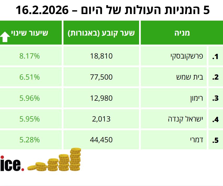 במסגרת 5 המניות העולות הבולטות: במקום הראשון ניצבת מניית פרשקובסקי שרושמת שינוי יומי חיובי בו היא מציגה זינוק של 8.17% לרמה של 18,810 אגורות. במקום השני ניצבת מניית בית שמש עם זינוק של 6.51% לרמה של 77,500 אגורות.
