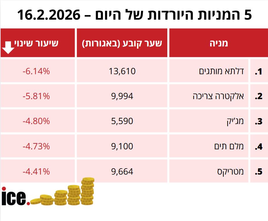 במסגרת 5 המניות היורדות הבולטות: במקום הראשון ניצבת מניית דלתא מותגים שרושמת צניחה של 6.14% לרמה של 13,610 אגורות. במקום השני ניצבת מניית אלקטרה צריכה עם ירידה של 5.81%- לרמה של 9,994 אגורות.