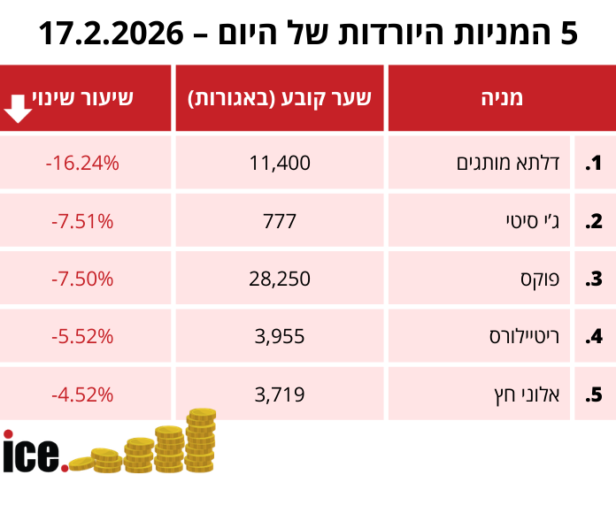 במסגרת 5 המניות היורדות הבולטות: במקום הראשון ניצבת מניית דלתא מותגים ביום השני ברציפות, אך הצניחה של היום גדולה כמעט פי שלושה מהירידה החדה שנרשמה אתמול. לאחר פרסום הדוחות של הרבעון הרביעי, מניית החברה רושמת היום צניחה של 16.24% לרמה של 11,400 אגורות. במקום השני ניצבת מניית ג'י סיטי עם ירידה של 7.51% לרמה של 777 אגורות.