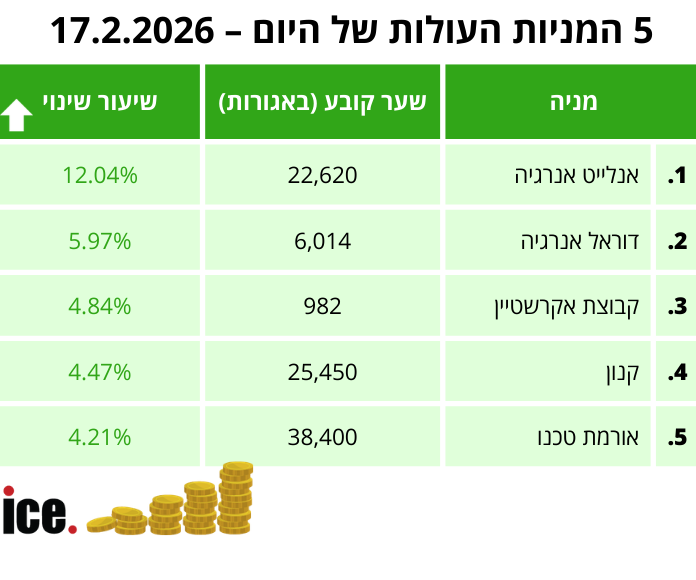 במסגרת 5 המניות העולות הבולטות: במקום הראשון ניצבת מניית אנלייט אנרגיה שרושמת שינוי יומי חיובי בו היא מציגה זינוק של 12.04% לרמה של 22,620 אגורות. במקום השני ניצבת מניית דוראל אנרגיה עם זינוק של 5.97% לרמה של 6,014 אגורות.