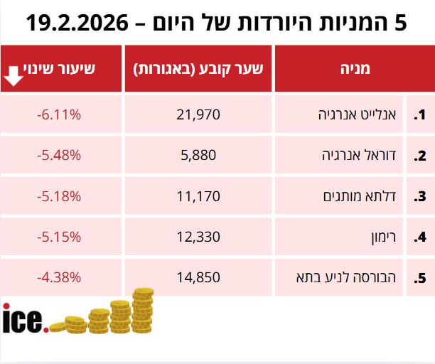 במסגרת 5 המניות היורדות הבולטות: במקום הראשון ניצבת מניית אנלייט אנרגיה עם צניחה של 6.11%- לרמה של 21,970 אגורות. במקום השני ניצבת מניית דוראל אנרגיה עם עלייה של 5.48%- לרמה של 5,880 אגורות.