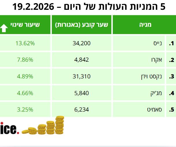 במסגרת 5 המניות העולות הבולטות: במקום הראשון ניצבת מניית נייס שהשתגרה ב-13.62% לרמה של 34,200 אגורות. במקום השני ניצבת מניית אקרו עם זינוק של 7.86% לרמה של 4,842 אגורות.