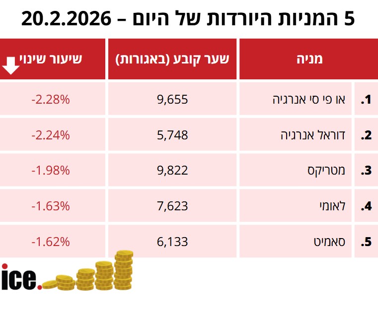 ברשימת המניות היורדות: או פי סי אנרגיה שמידרדרת ב-2.28% לשער 9,655 אגורות, דוראל אנרגיה שיורדת 2.24% לשער 5,748 אגורות. מטריקס נופלת ב-1.98% לשער 9,822 אגורות, לאומי יורדת ב-1.63% לשער 7,623 אגורות וסאמיט יורדת 1.62% לשער 6,133 אגורות.