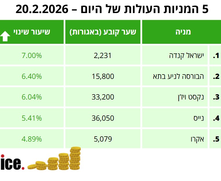 ברשימת המניות העולות: ישראל קנדה עם זינוק של 7% לשער 2,231 אגורות, הבורסה לניע ערך בתא שחוזרת לעלות לאחר יום אדום מבחינתה, ונוסקת ב-6.40% לשער 15,800 אגורות. נקסט ויז'ן ממשיכה לטפס עם עלייה של 6.04% לשער 33,200 אגורות.