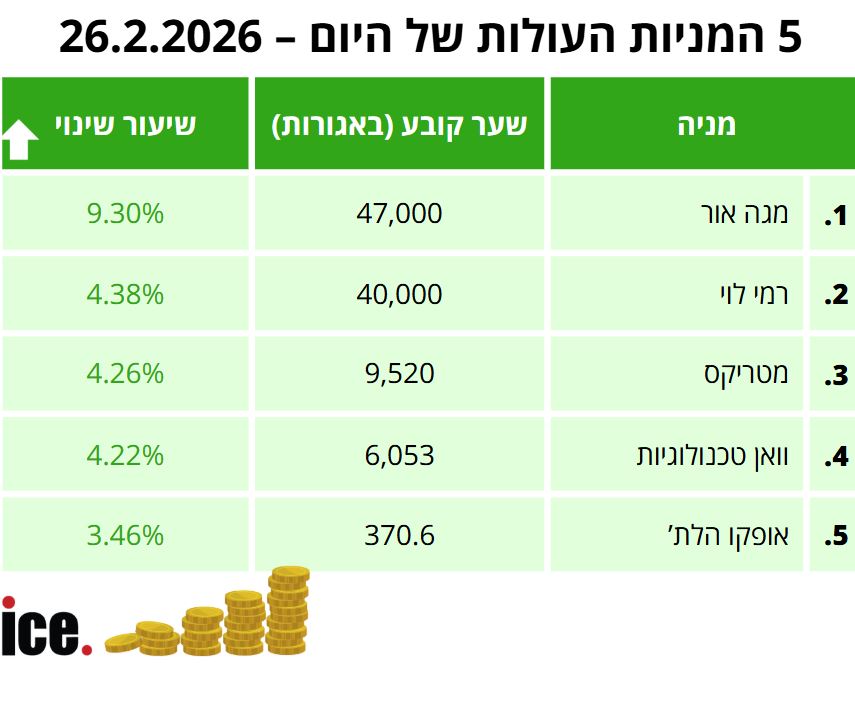 במסגרת 5 העליות הבולטות: במקום הראשון ניצבת מניית מגה אור עם שינוי יומי בו היא מציגה זינוק של 9.30% לרמה של 47,000 אגורות. במקום השני ניצבת מניית רמי לוי עם זינוק של 4.38% לרמה של 40,000 אגורות. במקום השלישי ניצבת מניית מטריקס עם עלייה של 4.26% לרמה של 9,520 אגורות.