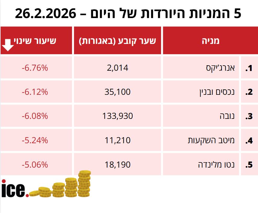 במסגרת 5 המניות היורדות הבולטות: במקום הראשון ניצבת מניית אנרג'יקס שמתרסקת עם ירידה של 6.76%- לרמה של 2,014 אגורות. במקום השני ניצבת מניית נכסים ובנין עם התרסקות של 6.12%- לרמה של 35,100 אגורות.