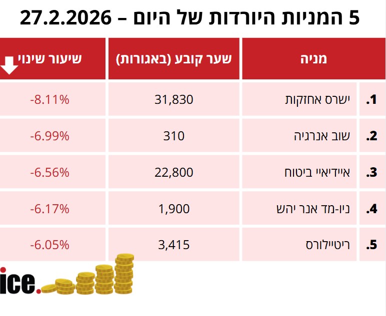 מנגד, בטבלה האדומה, יום המסחר האיר פחות פנים למשקיעים של חברת ישראס אחזקות, שספגה את המכה הקשה ביותר וצללה ב-8.11% לשער קובע של 31,830 אגורות. אחריה ממוקמת שוב אנרגיה, שאיבדה 6.99% מערכה בדרך לשער של 310 אגורות בלבד.