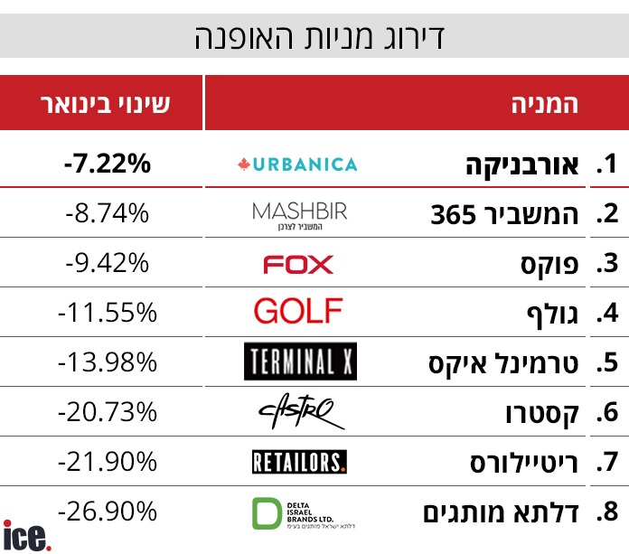 אם יש סקטור אחד שפברואר הנחית עליו מכה קשה, זה סקטור האופנה. כל המניות סיימו את החודש באדום, ללא יוצא מן הכלל, כשדלתא ישראל מותגים הובילה את הנפילות עם ירידה חדה של 26.9%.