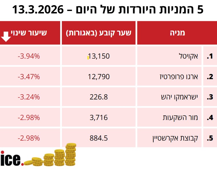 במסגרת 5 המניות היורדיות הבולטות: במקום הראשון ניצבת מניית אקויטל עם ירידה של 3.94%- לרמה של 13,150 אגורות. במקום השני ניצבת מניית ארגו פרופטיז עם ירידה של 3.47%- לרמה של 12,790 אגורות.