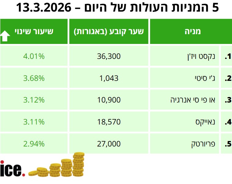 במסגרת 5 המניות העולות הבולטות: מניית מקסט ויז'ן כובשת את המקום הראשון עם עלייה של 4.01% לרמה של 36,300 אגורות. במקום השני מניית ג'י סיטי עם עלייה של 3.68% לרמה של 1,043 אגורות.