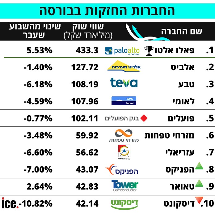 הסיפור המרכזי הוא בנק דיסקונט, שצנח ביותר מ-10% ונפל למקום האחרון בעשירייה הראשונה של הבורסה. שווי השוק שלו ירד לכ-42 מיליארד שקל, ושתי חברות עקפו אותו: הפניקס וטאואר, שתיהן סיימו את השבוע עם שווי גבוה יותר.