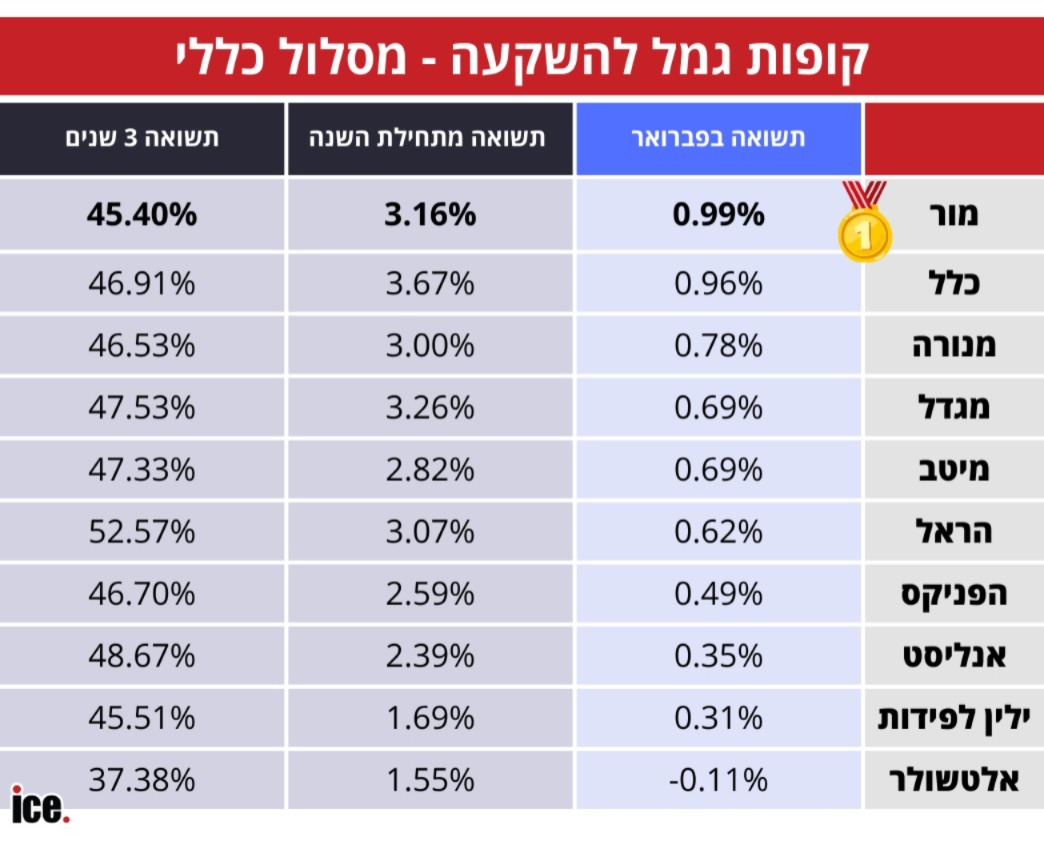 שינוי קטן בצמרת לעומת קרנות ההשתלמות: במסלול הכללי של קופות הגמל להשקעה, מור היא שהובילה בפברואר עם תשואה של 0.99%. כלל צמודה אחריה עם 0.96%, מנורה עם 0.78%, מגדל ומיטב עם 0.69% כל אחת, והראל עם 0.62%. הפניקס (0.49%), אנליסט (0.35%) וילין לפידות (0.31%) השלימו את הרשימה - ואלטשולר שחם שוב בתחתית, עם תשואה שלילית של 0.11%-.