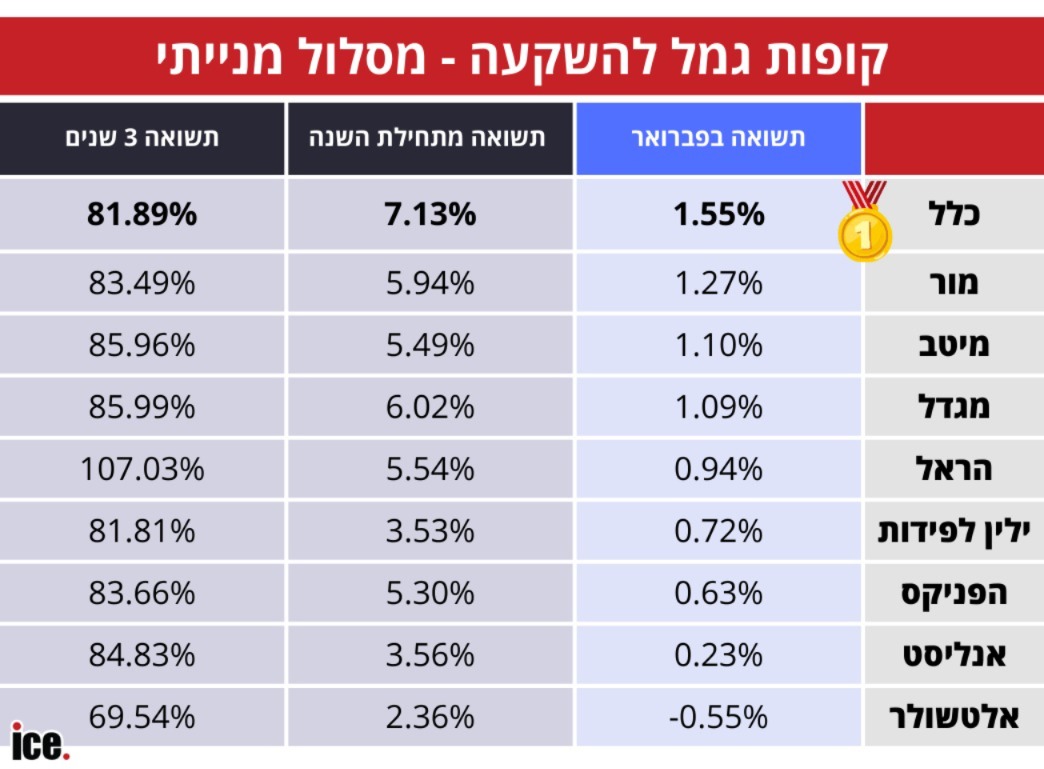 במסלול המנייתי, כלל שבה לאחוז בצמרת: 1.55% בפברואר ו-7.13% בשנה האחרונה - הגבוהה בטבלה. מור סיימה שנייה עם 1.27%, מיטב ומגדל עם 1.1% ו-1.09% בהתאמה, והראל עם 0.94% - נמוך יחסית לחודש, אך מעניין שב-3 שנים היא מובילה את כולן עם 107.03%. בתחתית: אלטשולר שחם עם ירידה של 0.55% בפברואר ותשואה שנתית של 2.36% בלבד.