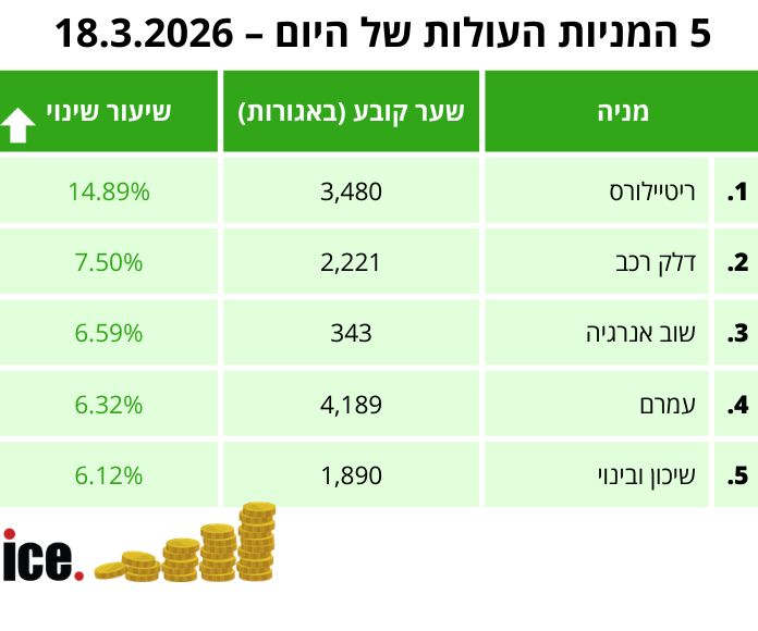 את טבלת המניות העולות של היום מובילה בגאון מניית ריטיילורס, שרשמה זינוק מטאורי של 14.89% והתייצבה על שער של 3,480 אגורות. במקום השני והמכובד מתברגת דלק רכב, שמטפסת ב-7.50% לרמה של 2,221 אגורות.