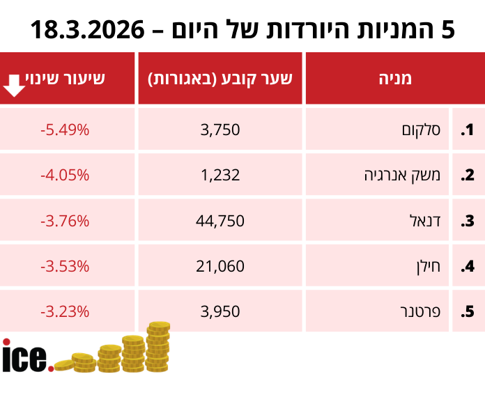 בגזרת המניות היורדות, מניית סלקום סופגת את המכה הקשה ביותר היום וצוללת ב-5.49% לשער של 3,750 אגורות, מה שמציב אותה בראש הטבלה האדומה. אחריה ממוקמת משק אנרגיה, שמאבדת היום 4.05% מערכה ויורדת לרמה של 1,232 אגורות.