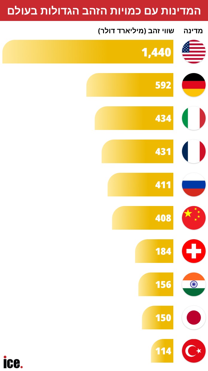 גרמניה, שתמיד נחשבה לכלכלה שמרנית ומחושבת, ניצבת במקום השני עם כ-3,350 טונות בשווי 592 מיליארד דולר - יותר מהתמ"ג השנתי של מדינות רבות. המסורת הגרמנית של חיסכון ואגירת רזרבות הוכיחה את עצמה שוב, ובגדול.