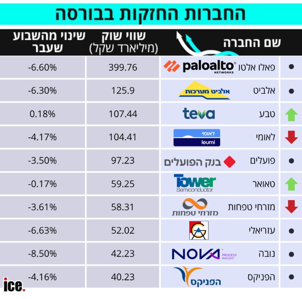 המקום הראשון שייך עדיין לפאלו אלטו נטוורקס, חברת אבטחת הסייבר הגדולה שנסחרת בתל אביב ובניו יורק, עם שווי שוק של כמעט 400 מיליארד שקל. אבל הגודל לא הגן עליה: השבוע היא איבדה 6.6% מערכה. מיד אחריה אלביט מערכות עם שווי של 125.9 מיליארד שקל - גם היא ירדה 6.3%, למרות שמדובר בחברת ביטחון ישראלית שהביקוש למוצריה לא נעלם לשום מקום.