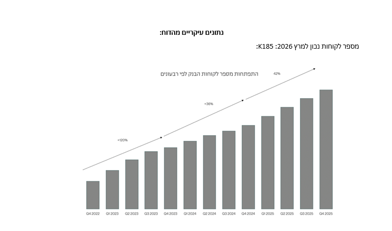 הבשורה החשובה של הבנק בדו"ח: הבנק סיים את שנת 2025 עם הפסד של כ-214 מיליון שקלים, ירידה של 20% בהשוואה ל-2024, כאשר עיקר הירידה בהפסד נובעת מהצמיחה המואצת בהכנסות, בזכות היקפי הפעילות הגדלים של הלקוחות. לא רק זאת, הבנק מעריך כי יגיע לאיזון בחודשים האחרונים של 2026.