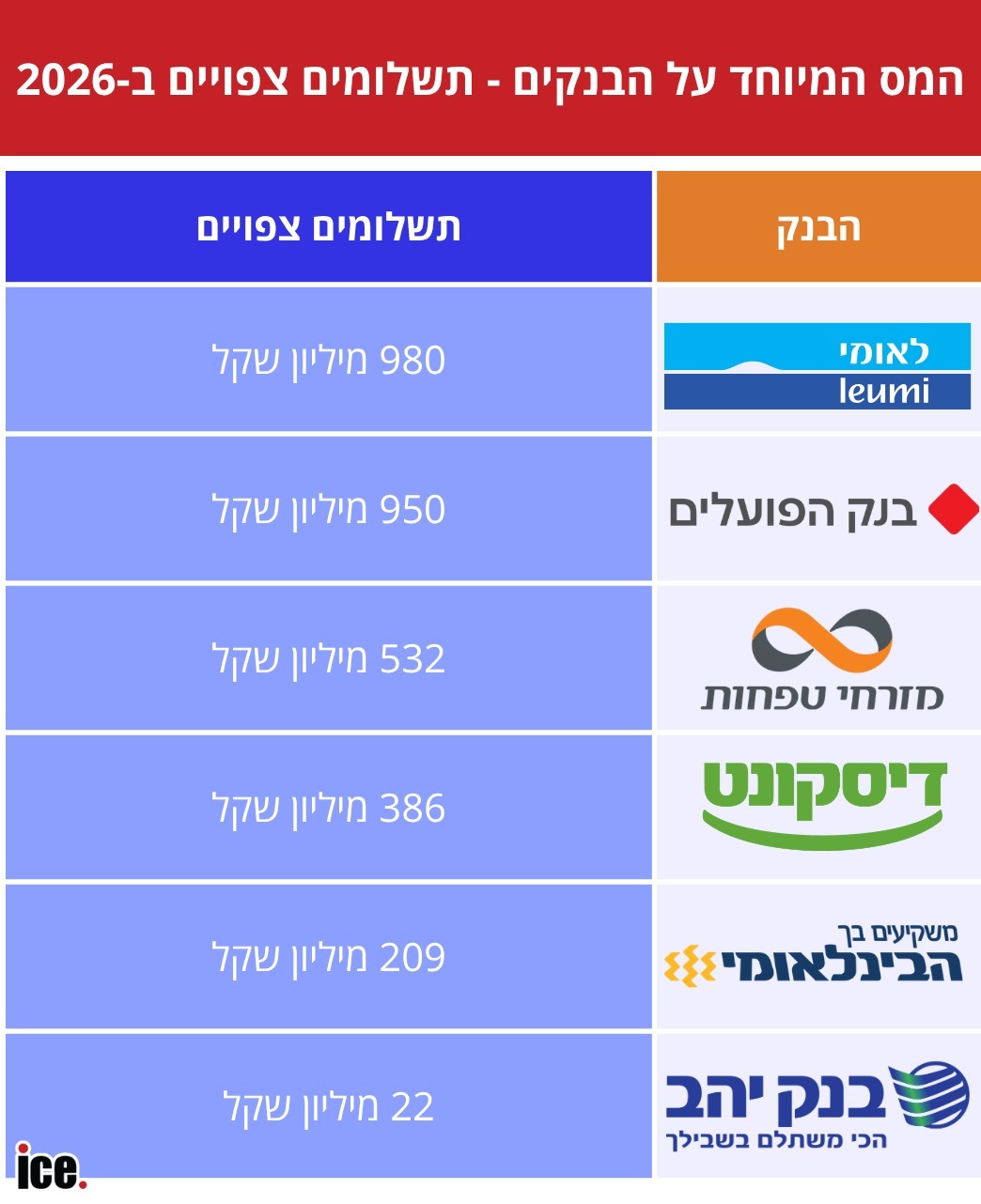 עדכון: דיסקונט דיווחה כי ב-2026 היא צפויה לשלם כ-330 מיליון שקל ב-2026 וכ-14 מיליון שקל ב-2027. הבינלאומי דיווחה כי תשלם בין 210-240 מיליון שקל ב-2026.