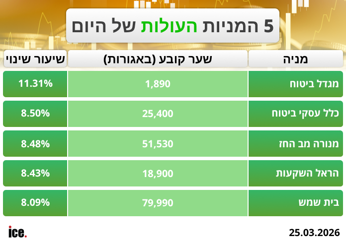 בראש רשימת חמש המניות העולות ניצבת מניית שופרסל שזינקה בשיעור של 14.83% לשער קובע של 4,593 אגורות. אחריה עלתה מניית מלם תים בשיעור של 7.46% לשער של 8,180 אגורות, מניית ריטיילורס שטיפסה ב-6.85% והגיעה לשער של 3,430 אגורות, מניית איביאי בית השקעות שעלתה ב-6.14% לשער של 32,500 אגורות, ומניית הפניקס שסגרה את החמישייה הירוקה עם עלייה של 6.00% ושער קובע של 16,600 אגורות.