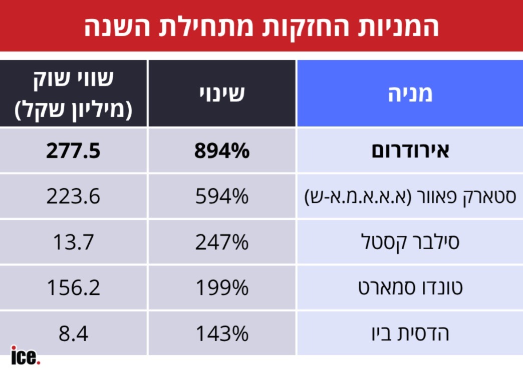 חמש המניות החזקות ביותר מתחילת השנה הן אירודרום (894%), סטארק פאוור (לשעבר אקופיה או א.א.א.מ.א-ש) (594%), סילבר קסטל (247%), טונדו סמארט (199%) והדסית ביו (143%). שווי השוק שלהן נע בין 8 ל-277 מיליון שקל - מה שמדגיש שמדובר בחברות קטנות, שבהן גיוס בודד או הודעה אחת יכולים להזיז את המחיר בעשרות אחוזים.
