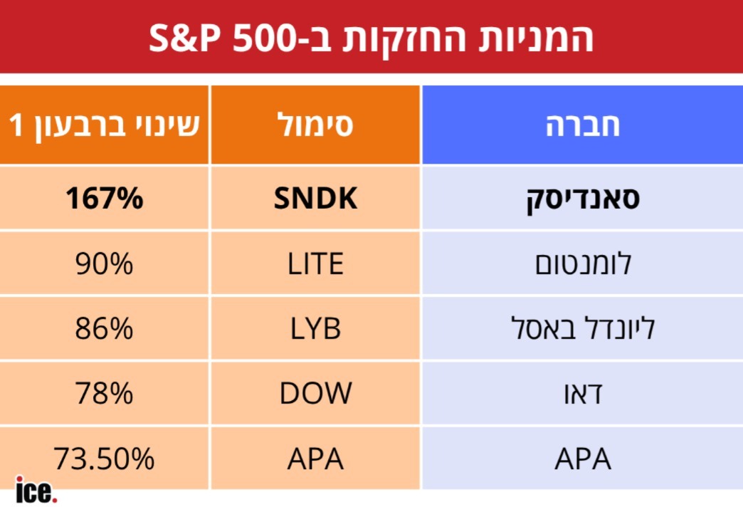 בעולם שבבי הזיכרון, סאנדיסק (SNDK) הפכה ל"מניית הרבעון" עם זינוק של 167%. המחסור העולמי בשבבי פלאש, בשילוב עם הביקוש לשרתי AI ותחנות קצה, הפך כל חדשות שליליות מהמגזר לרוח גבית עבורה.
