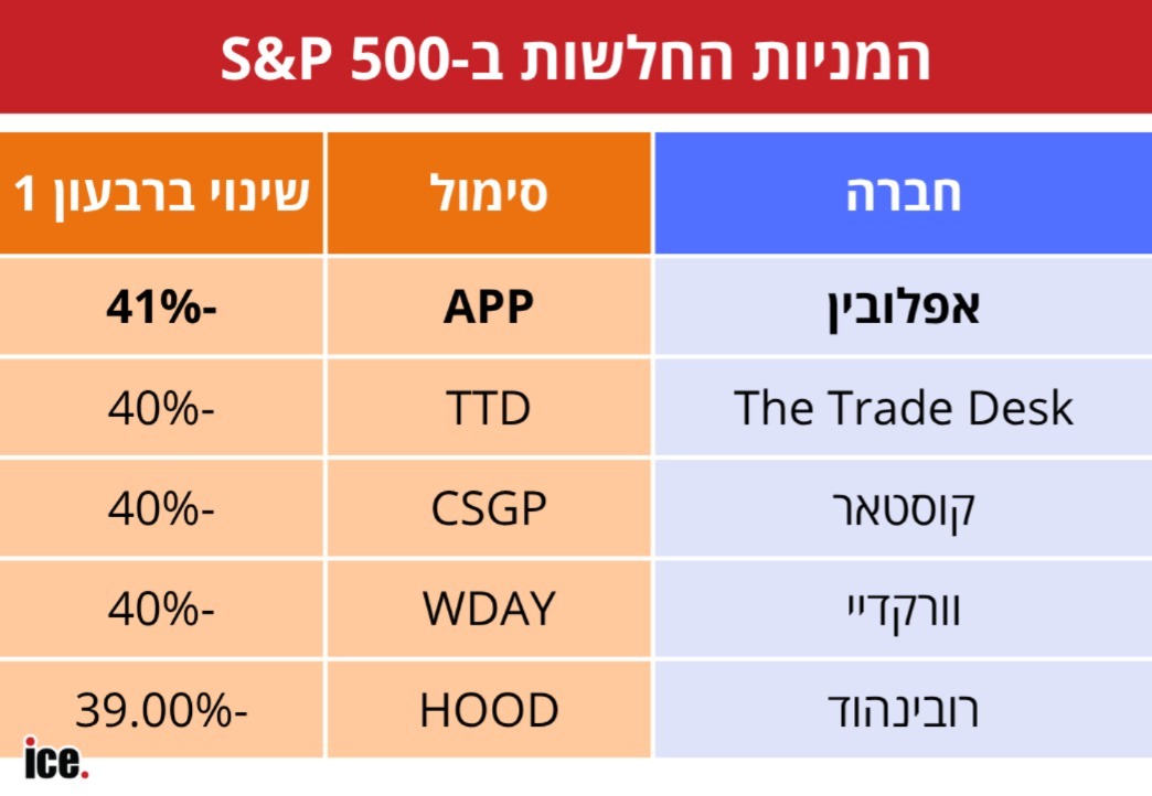וורקדיי, ענקית ה-SaaS לניהול משאבי אנוש, ירדה כ-40% לאחר שהתברר שחלק ניכר מהצמיחה שלה בא מרכישות ולא מפיתוח אורגני. אפלובין ו-The Trade Desk, שתיהן חברות פרסום דיגיטלי, ירדו גם הן בשיעור דומה - האחת בשל חשש שמנוע ה-AI שלה "נגמר" מבחינת פוטנציאל הצמיחה, השנייה בשל תחזית חלשה שהדאיגה את כל הסקטור.
