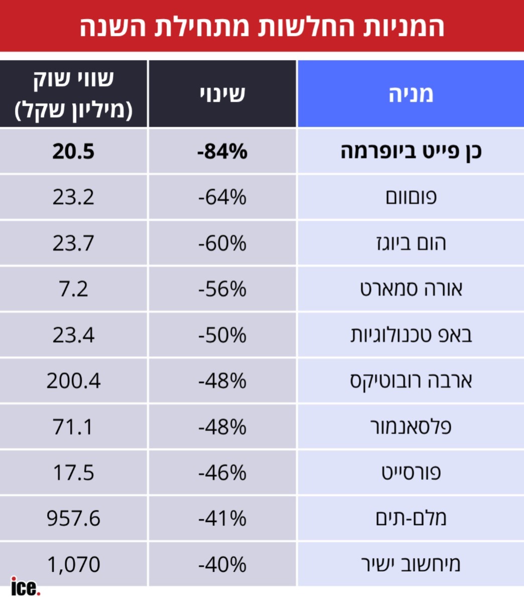 כן פייט (84% ירידה) חטפה את המכה הקשה ביותר. חברת הביוטק שפיתחה טיפול ניסיוני לסרטן הלבלב שווה היום כ-20 מיליון שקל בלבד. לאורך עשור שלם של גיוסים, דילולים ושריפת מזומנים, המניה איבדה 99.9% מערכה. גם דיווח על תוצאות בטיחות מעודדות לא שכנע שוק שכבר מכיר את הדפוס.