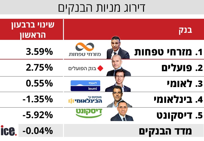 ברבעון הראשון של 2026, מדד הבנקים סיים כמעט ללא שינוי - מינוס 0.04% בלבד. אבל מאחורי הממוצע הזה מתחבא פער עצום: מזרחי טפחות עלתה 3.59% ומובילה את הדירוג. הפועלים הוסיפה 2.75% ולאומי עלתה מעט - 0.55%. לעומתן, הבינלאומי ירד 1.35%, ודיסקונט צנחה 5.92% - תוצאה הרבה יותר גרועה מכל מתחרותיה.