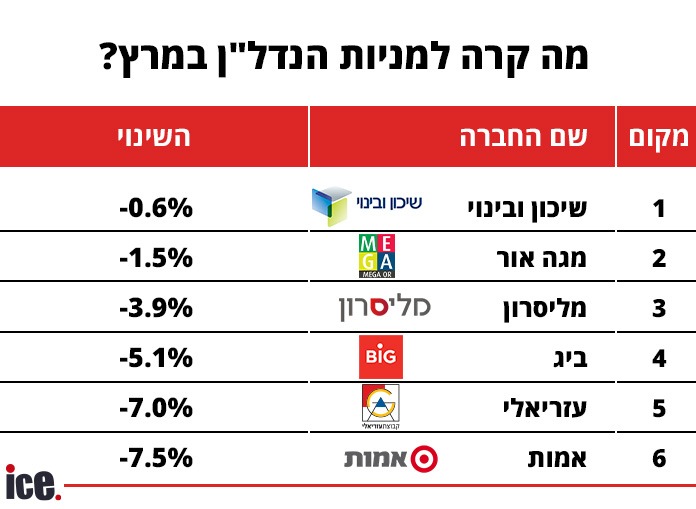 חודש מרץ לא היה חודש טוב למניות הנדל"ן והבנייה. קל מאוד להבין גם למה: המלחמה מול איראן הובילה לירידה משמעותית. הסיבות לכך הן כמובן האפשרות לעיכוב בפרויקטים, העיכוב בהפחתת ריבית (ללא מלחמה, בנתונים האלה, סביר שהנגיד היה חושב אחרת) שמשפיע מאוד על היזמים וחוסר ודאות - שזה הגורם שהכי משפיע על המשקיעים, במיוחד המשקיעים הזרים.