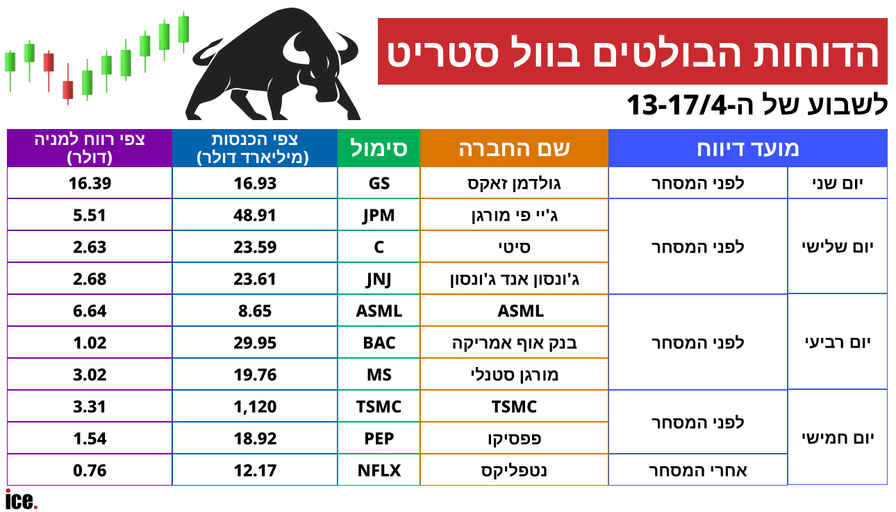 יום שני ייפתח עם הדוח של גולדמן זאקס, ויום שלישי יביא את שלושת ענקי הבנקאות האמריקאית: ג'יי פי מורגן, וולס פארגו וסיטי. בהמשך השבוע ידווחו בנק אוף אמריקה, מורגן סטנלי ועוד. השווקים לא מחפשים רק מספרים - הם מחפשים עדות לכך שהכלכלה האמריקאית עדיין עומדת איתנה, גם אחרי הזעזוע של מחירי הנפט.