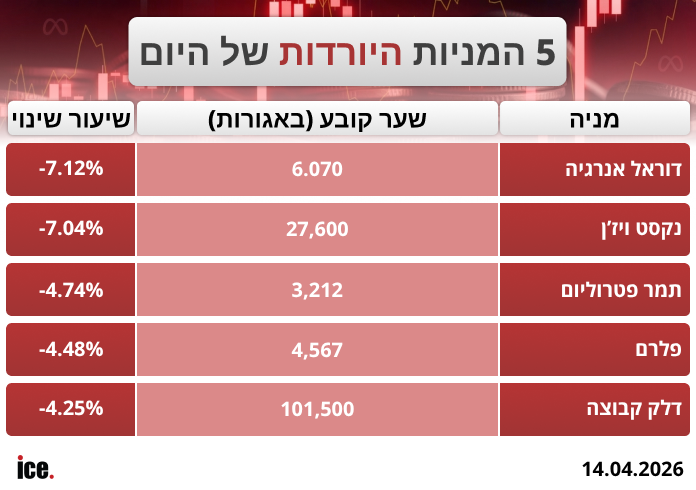 מנגד, הצד האדום של הלוח מספר סיפור שונה לחלוטין. דוראל אנרגיה רשמה את הירידה החדה ביותר בקרב המניות המובילות עם צניחה של 7.12% לשער של 6,070 אגורות. צמודה אליה נקסט ויז'ן שאיבדה 7.04% מערכה וחתמה בשער של 27,600 אגורות. מניית תמר פטרוליום ירדה ב-4.74% לשער של 3,212 אגורות. פלרם רשמה נסיגה של 4.48% לשער של 4,567 אגורות ומניית דלק קבוצה סוגרת את הרשימה עם ירידה של 4.25% לשער של 101,500 אגורות.