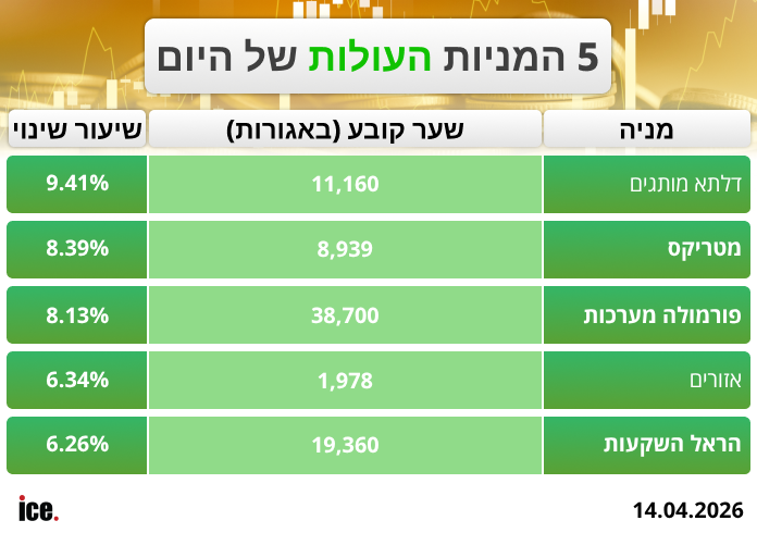 מניית דלתא מותגים מובילה את טבלת העולות עם זינוק של 9.41% לשער של 11,160 אגורות, כשאחריה מניית מטריקס רשמה עלייה נאה של 8.39% וחתמה בשער של 8,939 אגורות. פורמולה מערכות טיפסה ב-8.13% לשער של 38,700 אגורות, בעוד מניית אזורים עלתה ב-6.34% ועומדת כעת על שער של 1,978 אגורות. את החמישייה הירוקה חותמת הראל השקעות עם עליה של 6.26% וחתמה בשער של 19,360 אגורות.
