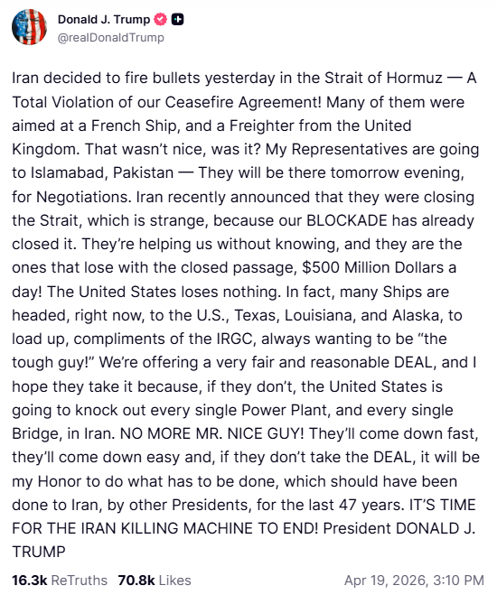 כעת, אחרי ההשתלטות על הספינה, טהרן מסרה שהסיכוי לשיחות פרודוקטיביות "לא ברור" - ובמלים עדינות יותר, שקיים ספק האם היא בכלל תגיע לשיחות. טראמפ, מצידו, הודיע כי אם איראן לא תחתום על הסכם, "כל הארץ תיהרס", תוך שהוא מציין כי כל תחנת כוח וכל גשר באיראן נמצאים על הכוונת.