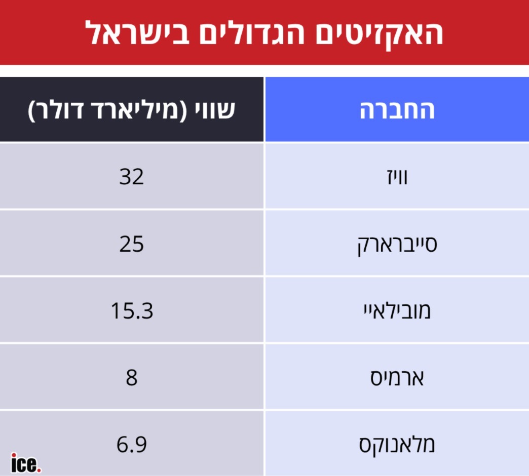 האקזיט הגדול מכולם - ואחד הגדולים בהיסטוריה הטכנולוגית העולמית - הוא של וויז (Wiz). חברת אבטחת הענן נמכרה לגוגל תמורת 32 מיליארד דולר. מה שמיוחד בעסקה הזו הוא שהיא כמעט לא קרתה: לפני כשנתיים, גוגל כבר ישבה עם וויז על מו"מ דומה, אך הוא קרס. מייסדי וויז בראשות אסף רפפורט פנו אז למסלול של הנפקה אפשרית בבורסה.