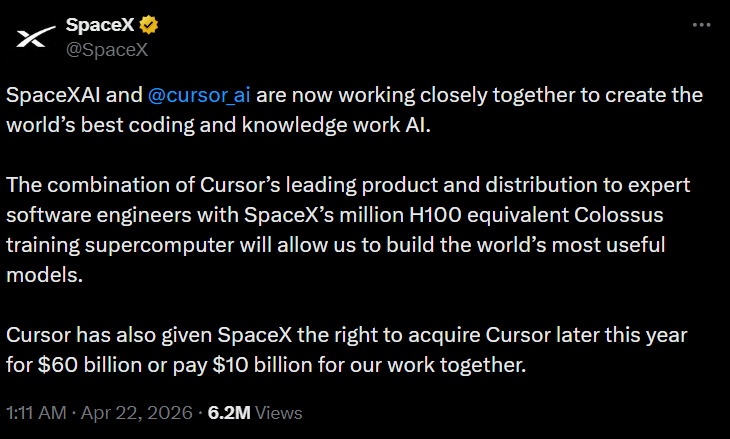 הבוקר פרסמה ספייס X הודעה רשמית בחשבון ה-X שלה: היא ו-Cursor מתחילות לעבוד יחד במטרה לבנות "את כלי הקידוד וה-AI לעבודת ידע הטוב בעולם". אבל מה שמשך את תשומת הלב לא היה שיתוף הפעולה עצמו - אלא פרט אחד קטן ומשמעותי מאוד: לספייס X ניתנה אופציה לרכוש את קרסר עד סוף השנה תמורת 60 מיליארד דולר. אם לא תממש את האופציה, תשלם לקרסר 10 מיליארד דולר תמורת שיתוף הפעולה בלבד.
