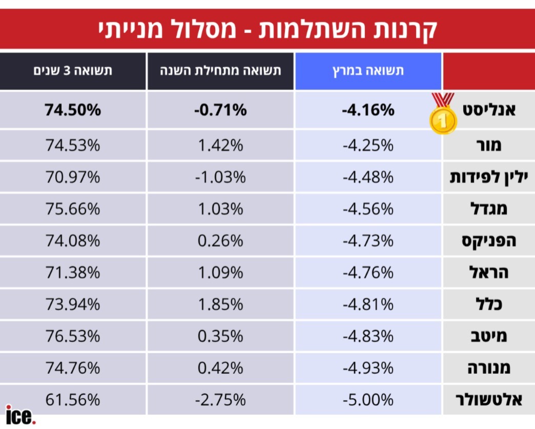 בתוך הסערה הזו, לא כל הקרנות נפגעו באותה מידה. במסלול הכללי - שבו שוהים רוב החוסכים בישראל - אנליסט הציגה את הביצוע הכי פחות גרוע עם ירידה של 1.62% בלבד במהלך מרץ. מור הגיעה שנייה עם ירידה של 1.82%. בהסתכלות מתחילת השנה, שתיהן עדיין שומרות על תשואה חיובית - אנליסט עם 0.27% ומור עם 1.09%.