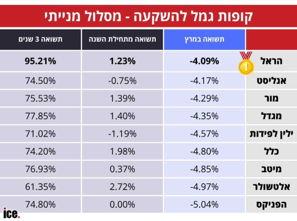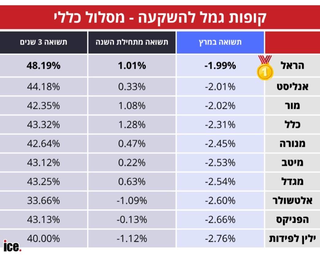 במסלול הכללי, שבו הסיכון מפוזר יותר ורוב החוסכים הבוחרים בגמל להשקעה נמצאים בו, הראל הובילה עם ירידה של 1.99% בלבד במרץ. זה אולי נשמע כמו הפסד, אבל בהשוואה לשוק ולמתחרות - זה ביצוע מרשים. אנליסט הגיעה שנייה עם 2.01%, ומור שלישית עם 2.02%. שלושתן מצליחות לשמור על תשואה חיובית מתחילת השנה, כאשר הראל מובילה גם שם עם 1.01%.