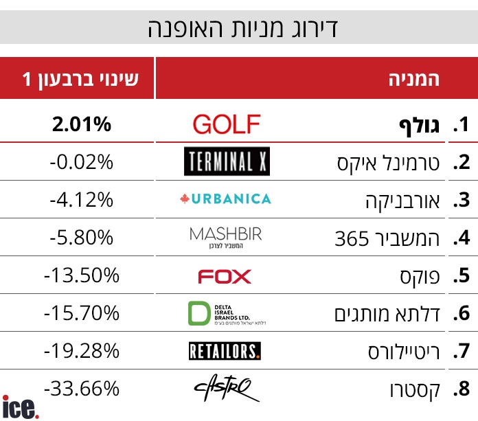 ברבעון הראשון לשנת 2026, מניית קסטרו ירדה ביותר מ-33% והייתה הנפגעת הגדולה ביותר בסקטור. נתון שמעמיד את קסטרו בתחתית לא רק של דירוג האופנה, אלא בין המניות הגרועות ביותר בבורסה הישראלית ברבעון. השילוב של הסביבה התחרותית, אי הוודאות הרגולטורית סביב הפטור ממע"מ, והמצב הכללי של הצריכה הפרטית - פגע בה קשה מהמתחרות.