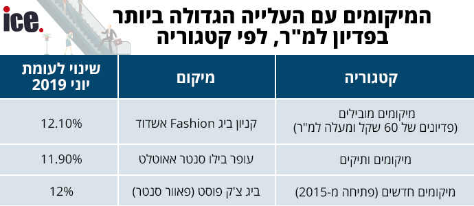 מבין הקניונים ומרכזי המסחר בהם הפדיונות חצו את ה-60 שקל למ"ר, העלייה הגדולה ביותר תועדה בקניון בין פאשן אשדוד (12.1%). בקרב המיקומים הוותירים מוביל עופר בילו סנטר אאוטלט עם עלייה של 11.9%, ובראש קטגוריית המיקומים החדשים, אלה שנפתחו מ-2015, עומד הפאוור סנטר ביג צ'ק פוסט (12%).